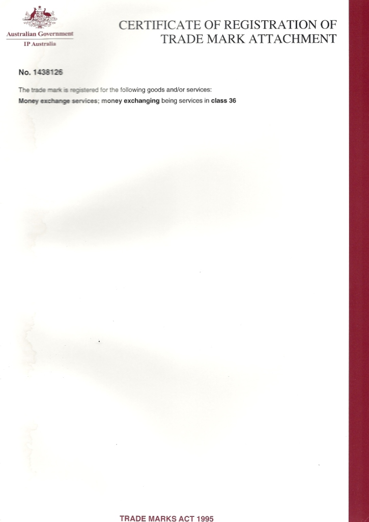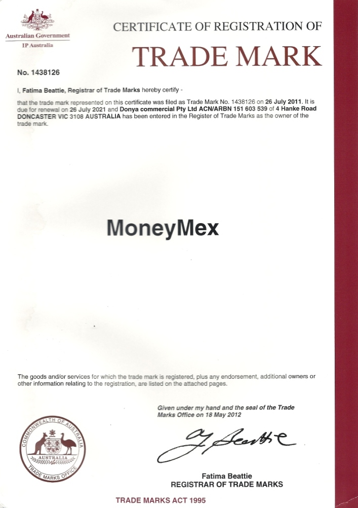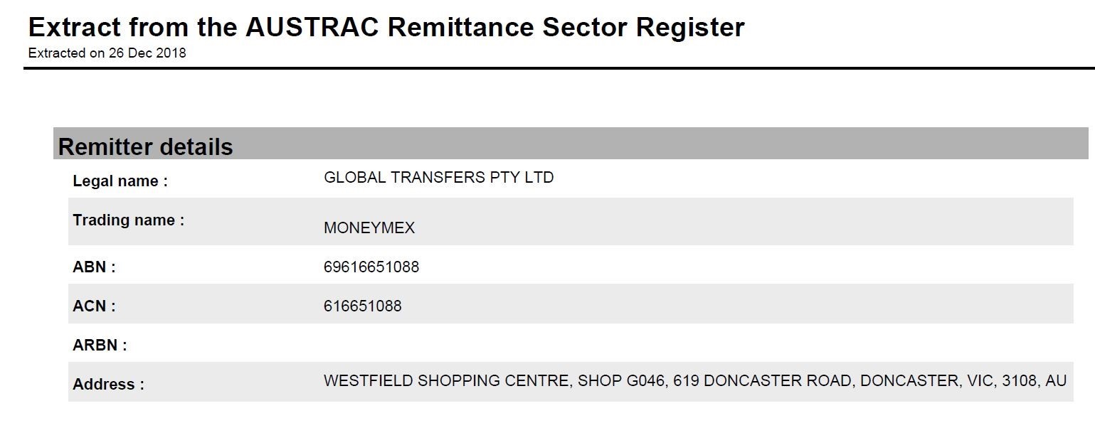 گروه صرافی مانیمکس با نام تجاری Global Transfers Pty Ltd در کشور استرالیا به ثبت رسیده و دارای شمارههای ثبت ABN: 69616651088 و ACN: 616651088 میباشد. این مجموعه همچنین دارای مجوزهای رسمی از آسترک با شمارههای IND100534335-001 و DCE100534335-001 است.