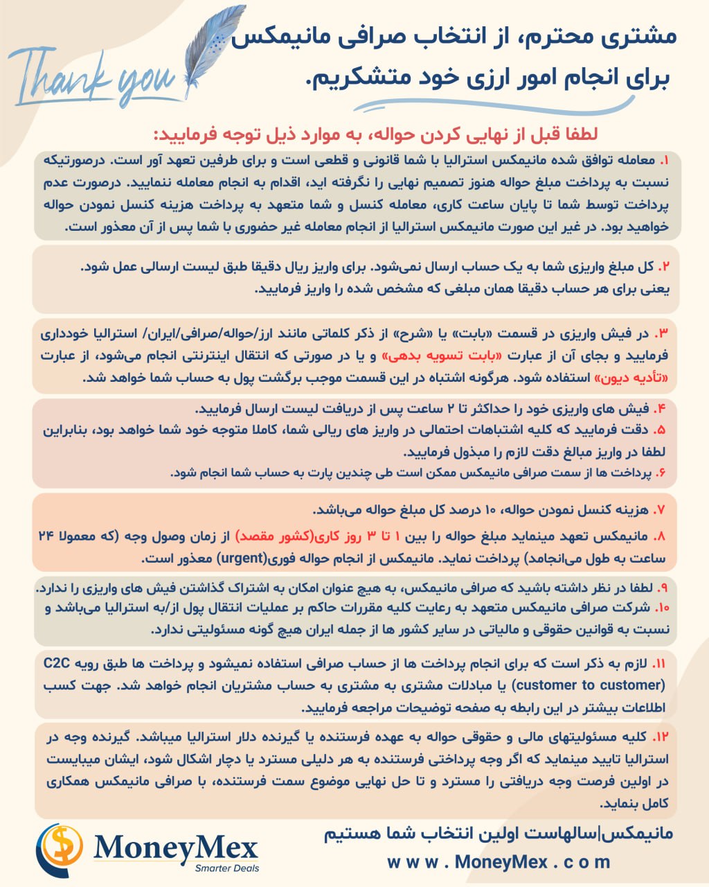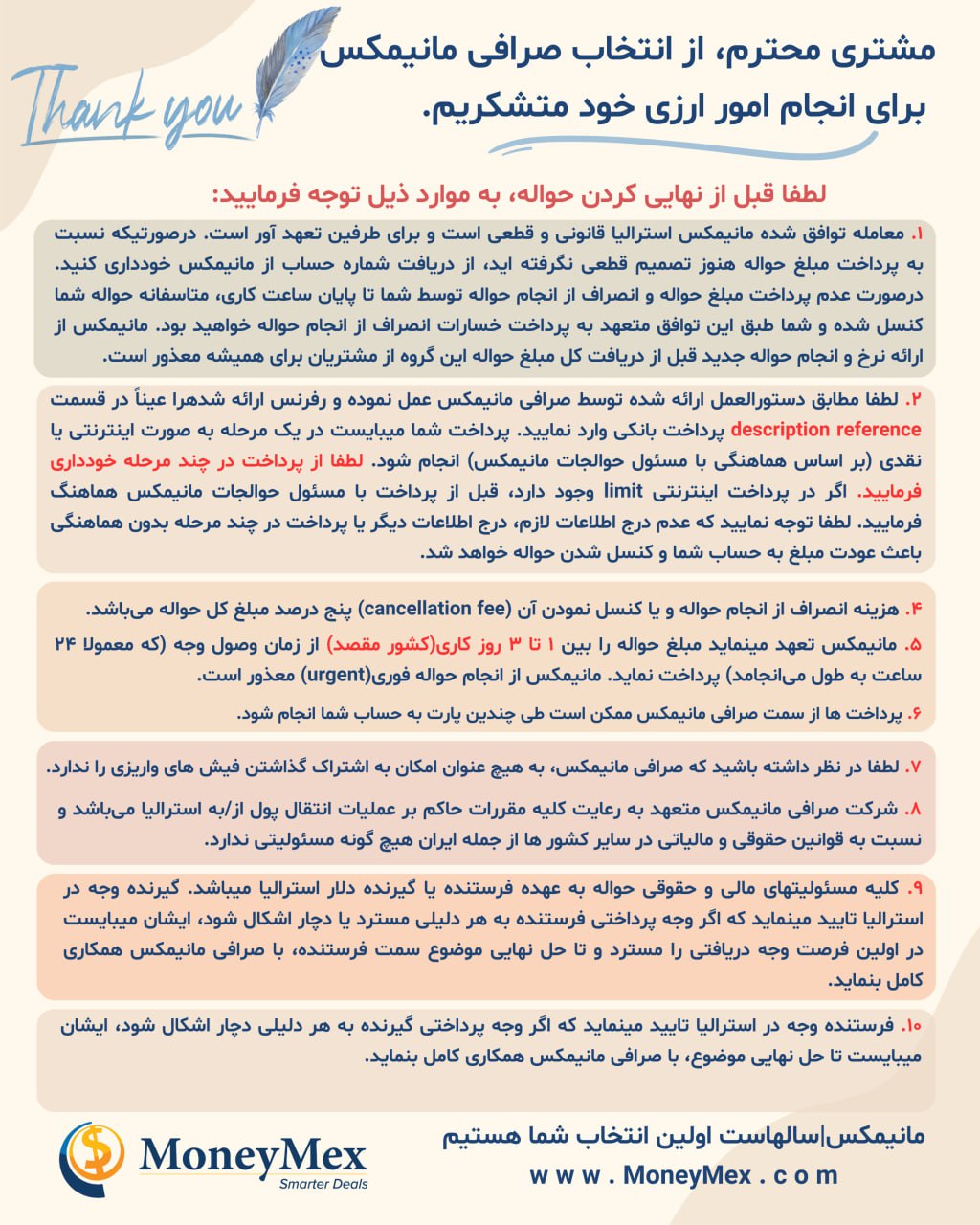 تا زمانی که پرداخت توسط شما انجام نشود و رسید پرداخت را برای کارشناسان ما ارسال نفرمائید، معامله شما از هیچگونه قطعیتی برخوردار نیست و در صورت تأخیر زیاد در پرداخت ممکن است باعث فسخ معامله شما شود؛ چرا که همانگونه که در جریان هستید به دلیل شرایط خاص سیاسی که کشور ایران درگیر آن است، نرخ تبدیل دلار استرالیا به ریال نوسانات لحظهای و شدیدی را تجربه میکند. لذا پس از انجام معامله و دریافت شماره حساب، پرداخت خود را انجام داده و رسید پرداختی را برای کارشناسان ما ارسال فرمائید.